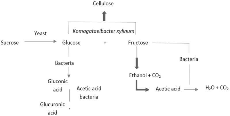 Je kunt het proces zelf uitproberen door bijvoorbeeld je thee gewoon te lang te laten staan, minstens twee weken, en dan te hopen op het beste. Of je kunt een SCOBY kopen, een 'Symbiotic Culture Of Bacteria and Yeast', toevoegen aan je thee en hem het werk laten doen. Deze levende cultuur van bacteriën en gist zet de suikers in de thee om in allerlei interessante verbindingen, waaronder azijnzuur, melkzuur, gluconzuur en glucuronzuur, die niet alleen de smaak beïnvloeden, maar ook de veronderstelde gezondheidsvoordelen van Kombucha creëren.